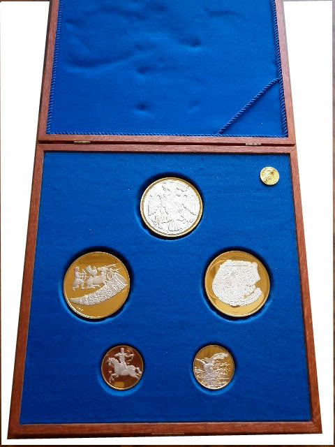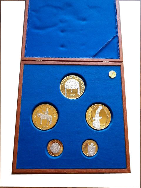 Millecentenárium szett. A Babits Kiadó emlékérem sorozata díszdobozban. Aranyozott ezüst érmek. 3x 320g és 2x 20g. 1kg összsúly. Befektetésnek, ajándéknak kiváló. Alkotó: Csóka Zsuzsa.